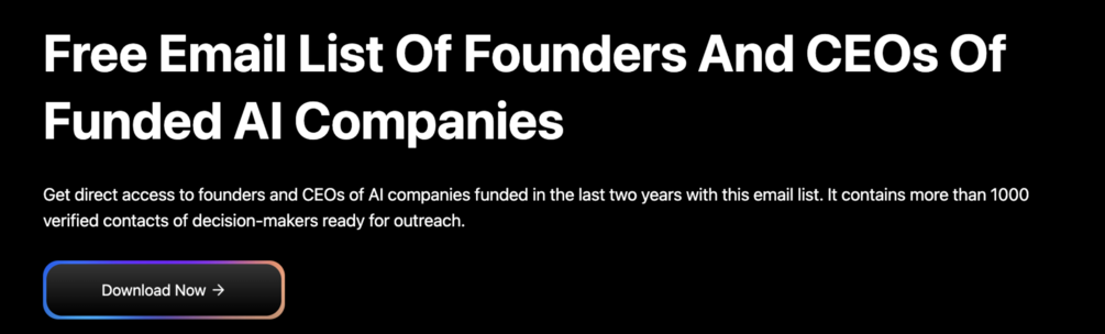 Get direct access to founders and CEOs of AI companies funded in the last two years with this email list. It contains more than 1000 verified contacts of decision-makers ready for outreach.